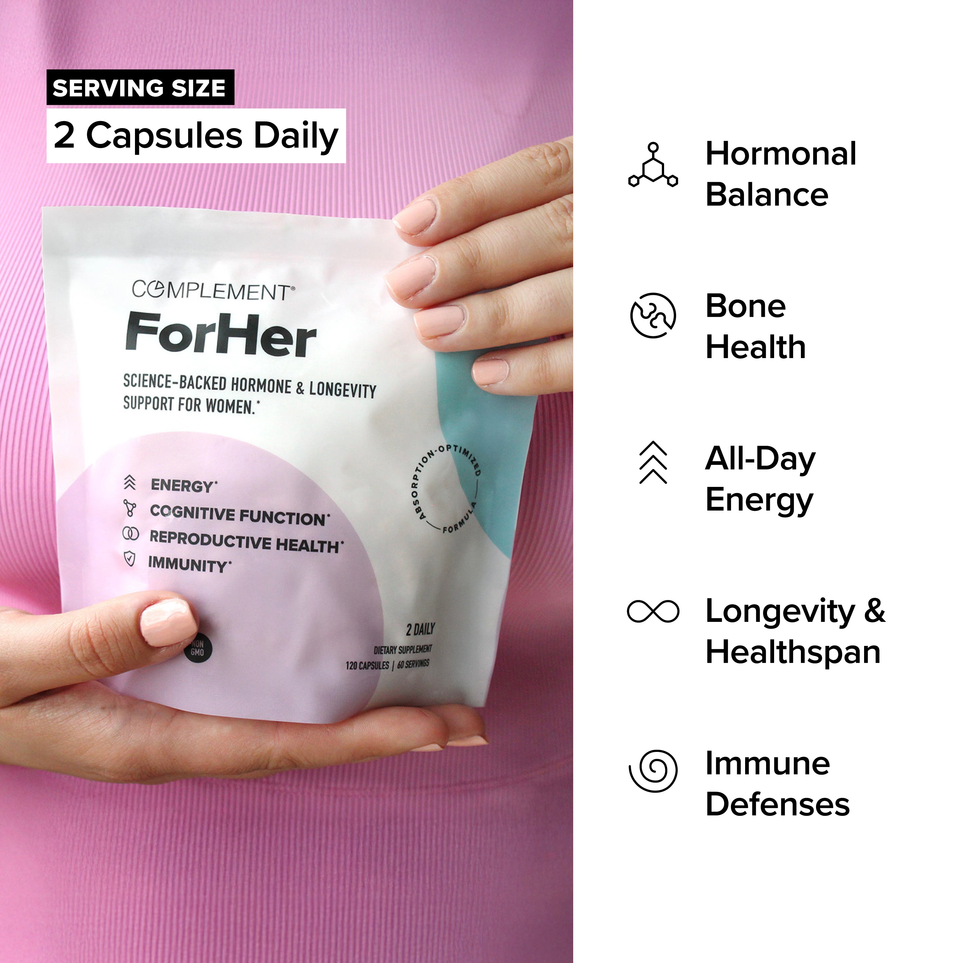 ForHer is designed to support hormonal balance, cognitive function, and longevity in women, and intended and can be taken in addition to Complement Essential or another multivitamin.*