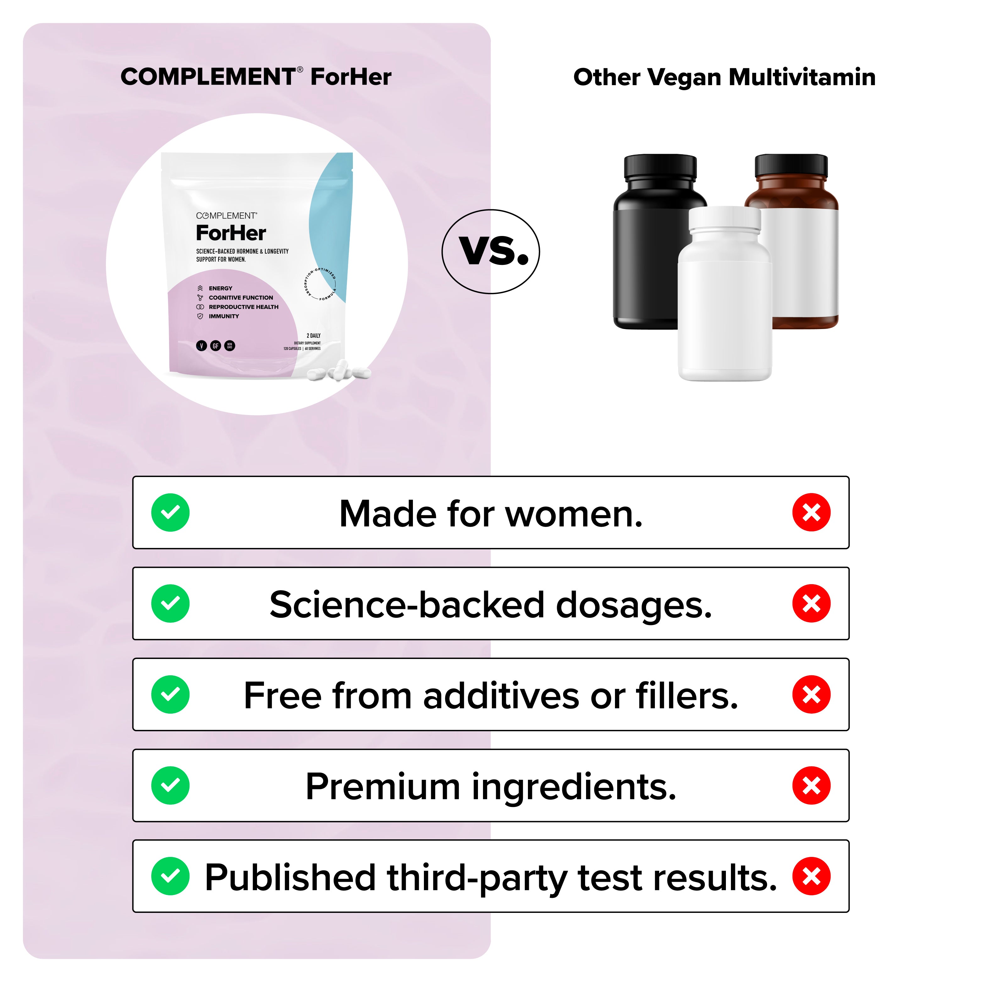 ForHer is formulated, produced, and third-party tested right here in the USA. Unlike most vitamin brands “white-labeling” products produced by another company, at Complement, we do it all ourselves. From sourcing to shipping, we’re with you every step of the way.